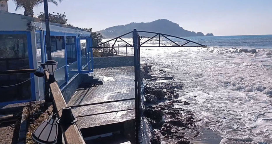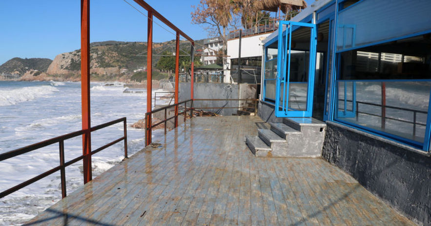 DALGA MASALARI SÜRÜKLEDİ Restoran çevresindeki cam korkuluğu aşan dalga, masa ve sandalyeleri sürükledi.
