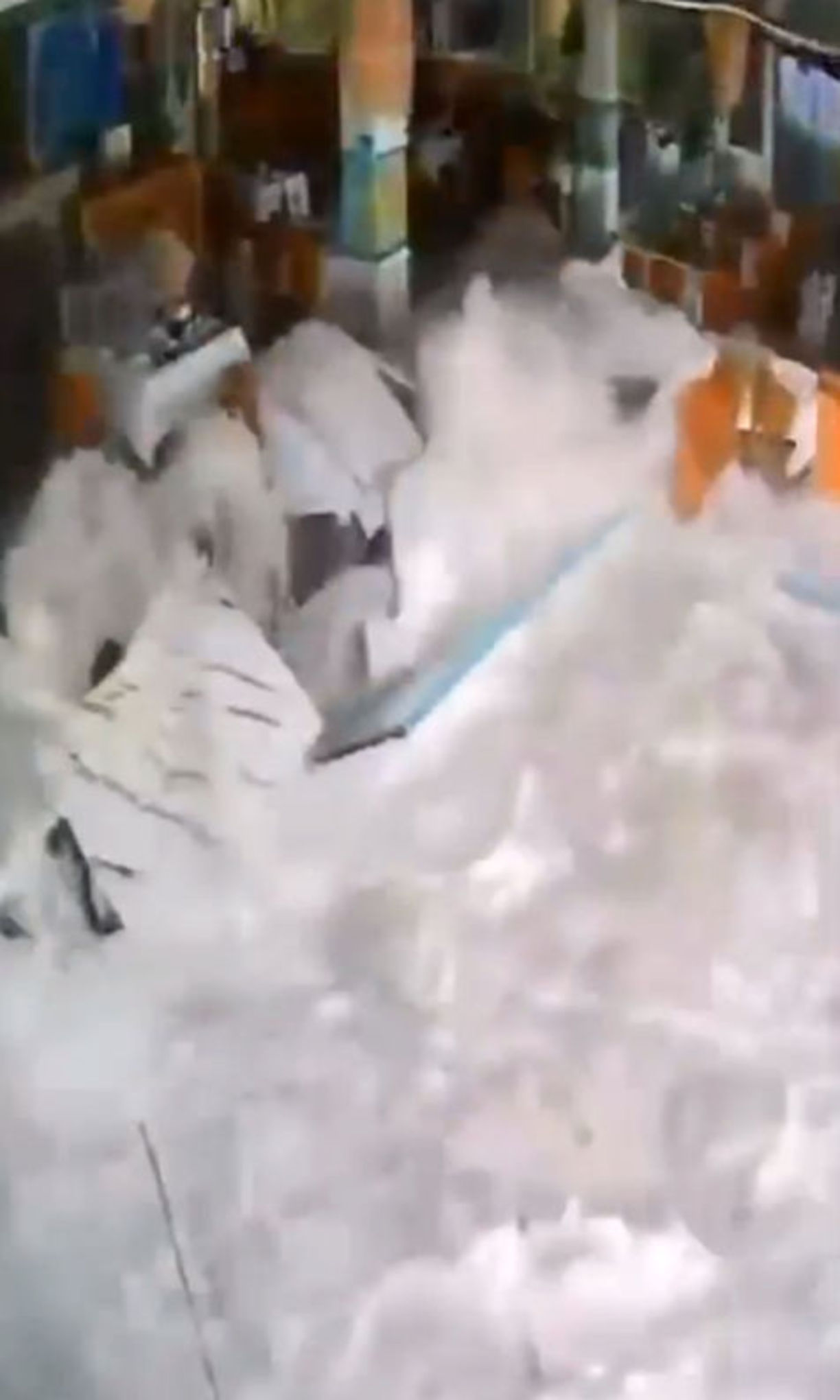 DALGANIN ETKİSİYLE DÜŞTÜ, YERDE SÜRÜKLENDİ Temizlik yapan restoran çalışanı da dalganın etkisiyle yere düştü. Sürüklenen restoran çalışanının dalgadan kaçmaya çalıştığı anlar, kameraya yansıdı.