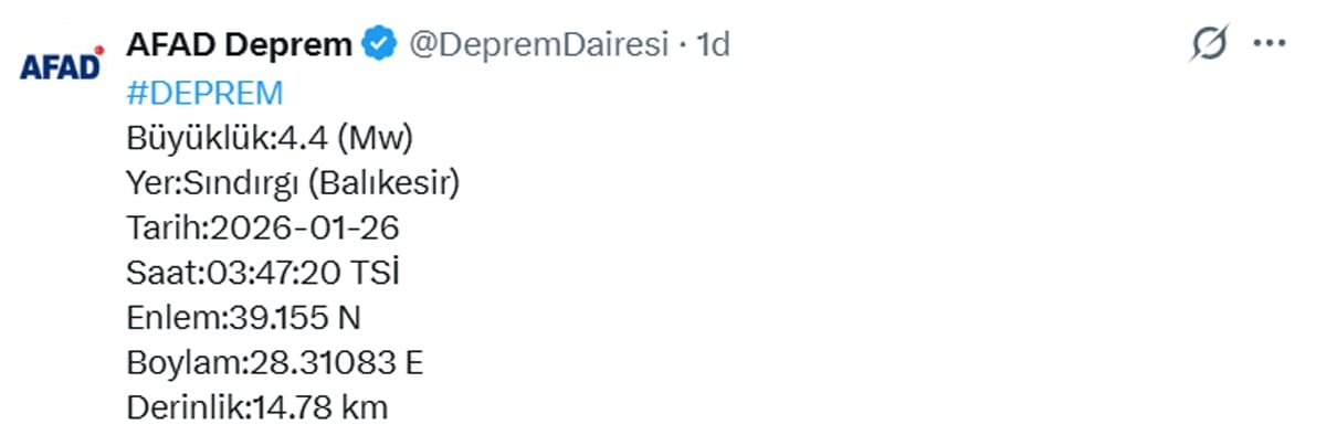 Afet ve Acil Durum Yönetimi Başkanlığı (AFAD) Deprem Dairesi verilerine göre saat 03.47'de Balıkesir'de 4.4 büyüklüğünde deprem meydana geldi.