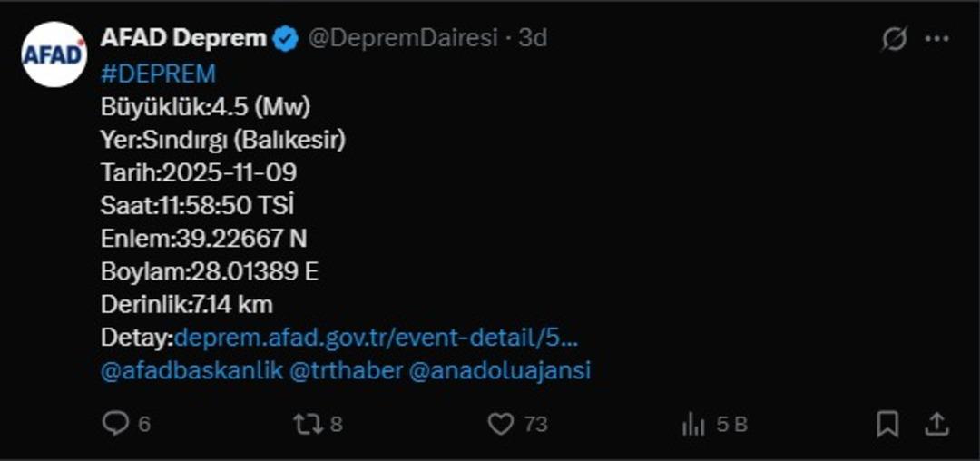 Bu konudaki diğer haberler:SON DAKİKA: Balıkesir Sındırgı da 4.9 büyüklüğünde deprem oldu! Balıkesir Sındırgı depremi ne zaman, saat kaçta oldu, kaç saniye sürdü?