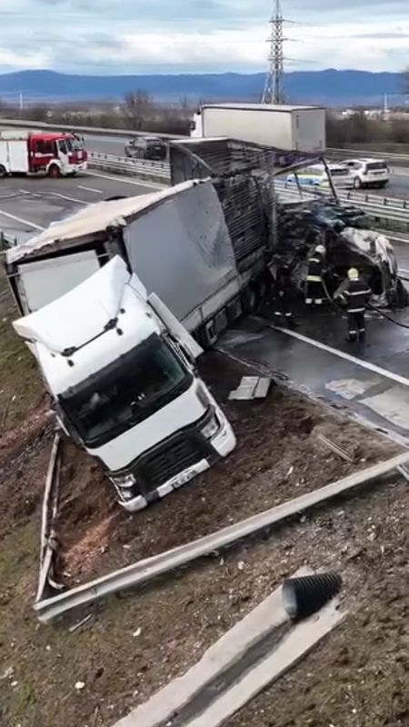 Bulgaristan'ın başkenti Sofya'daki otoyolda arıza nedeniyle yol kenarında duran TIR'a arkadan gelen başka bir TIR çarptı.