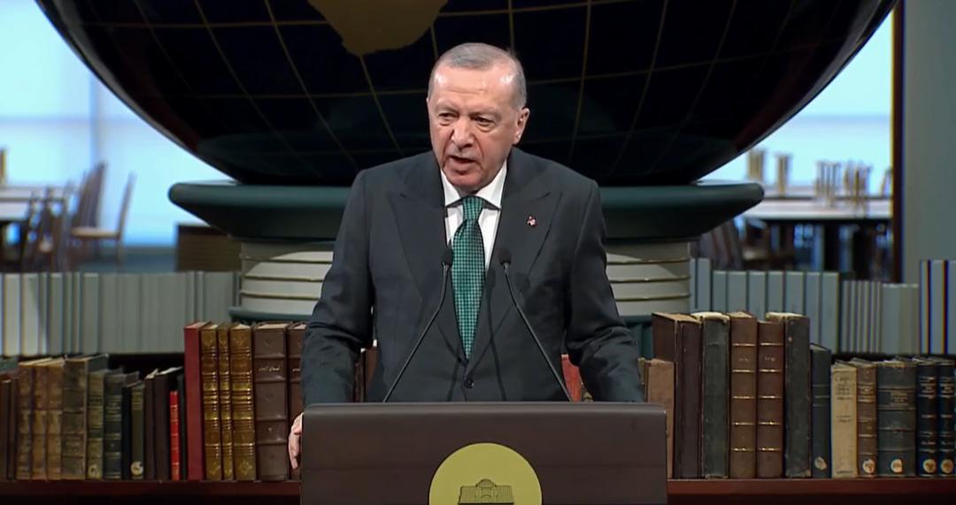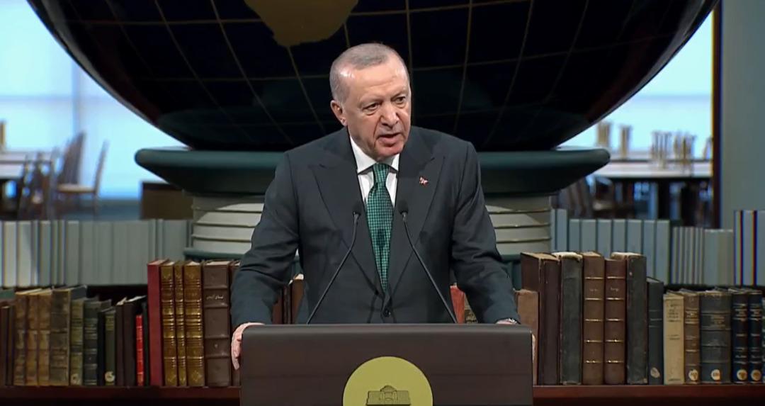 Görüşmenin ardından Cumhurbaşkanı Erdoğan Cumhurbaşkanlığı Millet Kütüphanesi'nde konuşma gerçekleştiriyor: