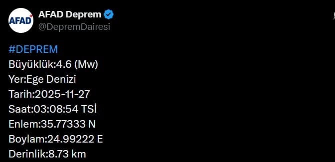 Afet ve Acil Durum Yönetimi Başkanlığının (AFAD) internet sitesinde yer alan bilgiye göre, Ege Denizi'nde 4,6 büyüklüğünde sarsıntı kaydedildi.