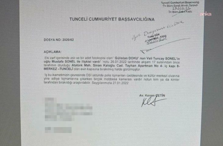 Buna göre dönemin Tunceli Barosu Başkanı Kenan Çetin’in şehirde bulunan evinin kapısına 26 Ocak 2026 akşamı bir not bırakıldı. Notta “Gülistan Doku’nun Vali Tuncay Sonel’in oğlu Mustafa Sonel ile ilişkisi vardı” ifadeleri yazıldı.