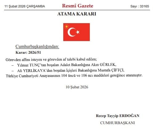 Resmi Gazete'de yayımlanan kararlara göre, kabinede kritik değişiklikler yapıldı. Buna göre, AKP'li Cumhurbaşkanı Recep Tayyip Erdoğan, Yılmaz Tunç Adalet Bakanlığı görevinden alındı yerine İstanbul Cumhuriyet Başsavcısı Akın Gürlek atandı. Ali Yerlikaya ise İçişleri Bakanlığı görevinden alındı, yerine Erzurum Valisi Mustafa Çiftçi atandı.