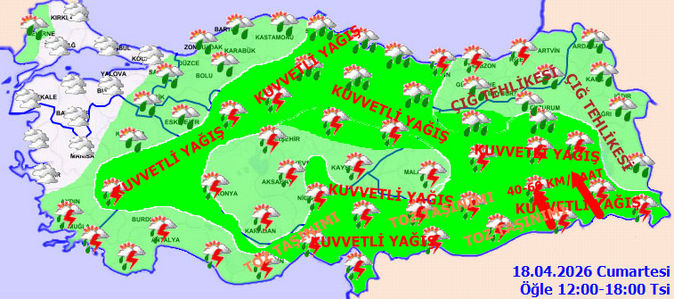 GÜNEYDOĞU'DA ŞİDDETLİ SAĞANAK VAR Yağışların, İç Ege, Akdeniz, İç Anadolu’nun kuzey ve doğusu, Orta Karadeniz, Doğu Anadolu’nun güney ve batısı ile Sinop, Giresun, Erzurum ve Muş çevrelerinde kuvvetli, Güneydoğu Anadolu ile Osmaniye, Hatay, Kahramanmaraş, Elazığ, Bingöl, Bitlis, Şırnak ve Hakkari çevrelerinde yer yer çok kuvvetli ve şiddetli olması bekleniyor.