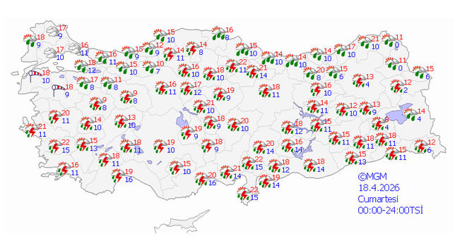 Meteoroloji Genel Müdürlüğü tarafından yapılan son değerlendirmelere göre ülkemiz genelinin parçalı ve çok bulutlu, Marmara’nın doğusu, Ege, Akdeniz, İç Anadolu, Karadeniz, Doğu ve Güneydoğu Anadolu ile Edirne çevrelerinin aralıklı sağanak ve gök gürültülü sağanak yağışlı geçeceği tahmin ediliyor.