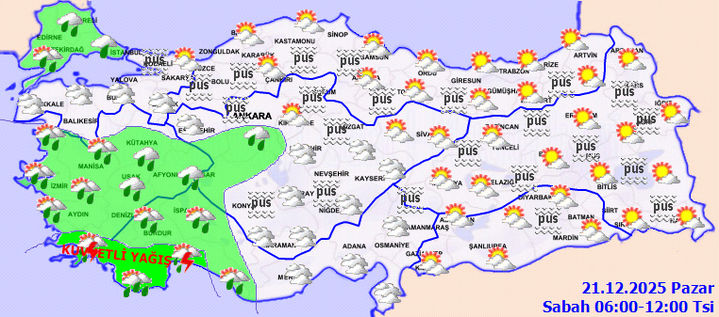 Yağışların; Muğla ve Antalya çevrelerinde yerel kuvvetli olması bekleniyor. Gece ve sabah saatlerinde iç ve doğu bölgelerde pus ve yer yer sis bekleniyor.