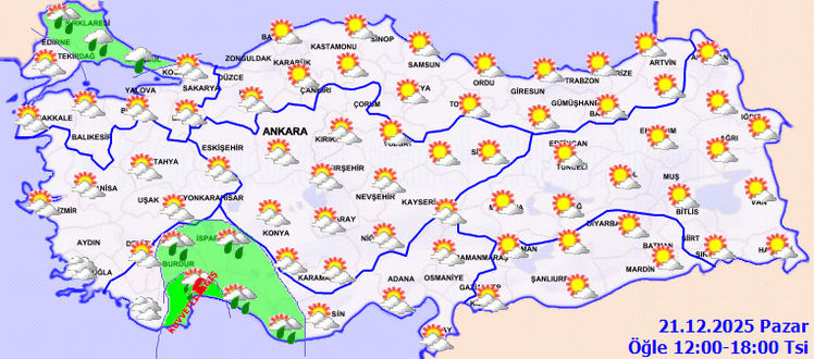 SICAKLIK AÇIKLAMASITrakya, Ege, Batı Akdeniz, İstanbul çevreleri, Ankara ve Eskişehir’in güneyi ile Konya’nın kuzey ve batısının yağmur ve sağanak, Güney Ege ve Batı Akdeniz kıyılarının gök gürültülü sağanak yağışlı geçeceği tahmin ediliyor.