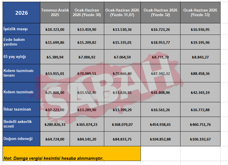 25 bin 808 TL olarak uygulanan kıdem tazminatı 2026 yılında yüzde 31,07 zamla 33 bin 826 liraya ulaşacak.