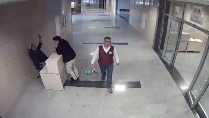 “HÜKÜMLÜ ÇAYCI, SAVCIYI KAPIYA DOĞRU SÜPÜRDÜ” “Olay günü sanık baskın yaparak odama geldi. ‘Gideceksin buradan, bunun sözünü vereceksin bana’ dedi. Masama kadar geldi dayandı. O sırada kalemi aramaya çalıştım. Sanık arkamdan telefonu kapattı. Elimi kolumu tuttu. Kafamı bastırdı. Sanığa güç yetiremedim. Sonra silahı çıkarttı mermiyi ağzına sürdü. Sanığın ateş edeceğini gerçekten düşünmedim. Beni bezdirmeye çalıştığını düşündüm. Çaycı geldi, ‘bana saldırıyor’ dedim çaycıya. Aramıza girdi, sanığı kapıya doğru süpürdü.