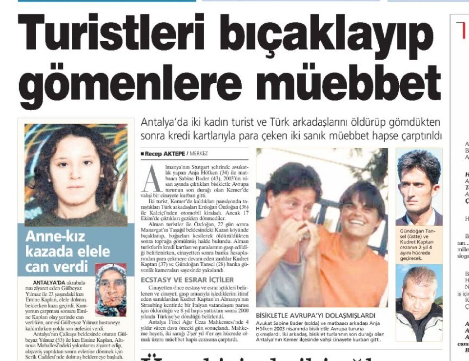 Yıl 2003. Ekim ayının ilk haftası… Türkiye’de hava, mevsim normallerinin üzerinde seyrediyor; sıcak sonbahar, yabancı turistlerin de ilgisini çekiyordu. O turistlerden ikisi, Avrupa turuna bisikletle çıkan; Almanya’da matbaacılık yapan 34 yaşındaki Anja Höfken ile 43 yaşındaki avukat arkadaşı Sabine Bader idi.