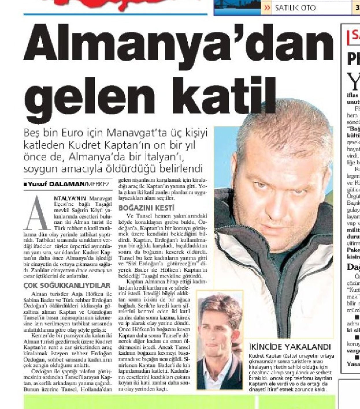 Gasp ettikleri parayı çektikten sonra Köprülü Kanyon’a dönen zanlılar, iki Alman turisti bir ağaca bağladı ve boğazlarını keserek öldürdü. Cesetleri bel hizasına kadar toprağa gömen ikili, kadınların fotoğraf makinesi ile üç cep telefonunu da alarak Antalya’ya döndü.