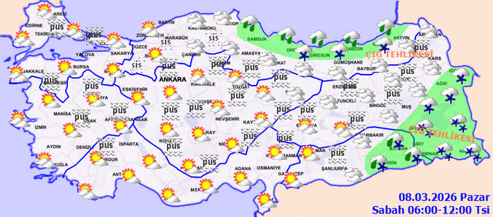 ÇIĞ TEHLİKESİNE DİKKATDoğu Karadeniz'in iç kesimleri ile Doğu Anadolu'da yüksek kar örtüsüne sahip eğimli alanlarda çığ ve kar erimesi tehlikesi bulunduğundan yaşanabilecek olumsuzluklara karşı dikkatli olunması da istendi.