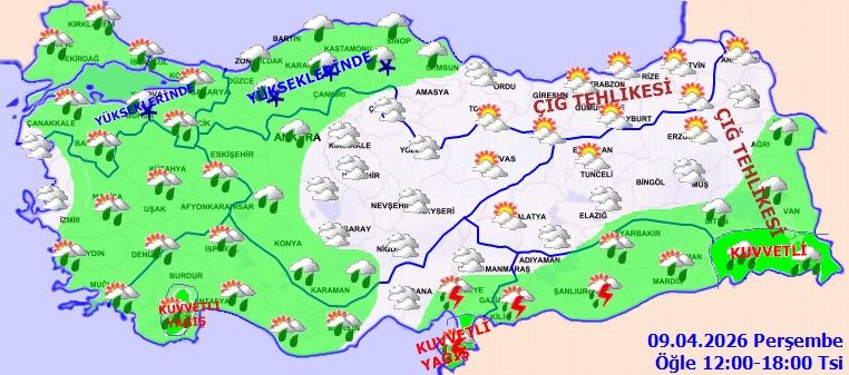 Meteoroloji Genel Müdürlüğü tarafından yapılan son değerlendirmelere göre: Ülkemiz genelinin parçalı ve çok bulutlu, İzmir'in kuzey kesimleri dışında kalan diğer bölgelerimizin aralıklı yağışlı geçeceği tahmin ediliyor. Yağışların genellikle yağmur ve sağanak, Güneydoğu Anadolu'da yer yer gök gürültülü sağanak, Doğu Karadeniz'in iç kesimleri, Doğu Anadolu'nun kuzey ve doğusu ile öğle saatlerinden itibaren Batı Karadeniz'in iç kesimleri ile gece saatlerinde İç Anadolu'nun doğusunda karla karışık yağmur ve yer yer kar şeklinde olması bekleniyor. Yağışların Doğu Anadolu'nun güneydoğusu (Van hariç), Güneydoğu Anadolu'nun doğusu, Antalya'nın batı kesimleri, Osmaniye ve Hatay çevreleri ile akşam saatlerinden itibaren Tunceli, Bingöl, Ağrı, Muş, Erzurum'un güney kesimleri ve Elazığ çevrelerinde yer yer kuvvetli olacağı tahmin ediliyor. İç ve doğu kesimlerde buzlanma ve don ile birlikte Doğu Karadeniz'in iç kesimleri ile Doğu Anadolu'da yüksek kar örtüsüne sahip eğimli alanlarda çığ ve kar erimesi tehlikesi bulunmaktadır.
