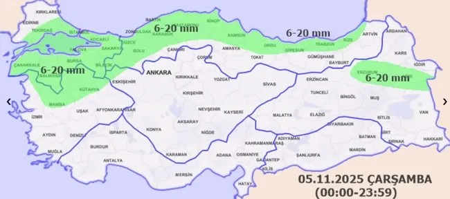 5 Kasım Çarşamba günü, yağışlı hava etkisini artırarak kuzeye doğru kaymakta ve yayılmaktadır. Marmara ve Batı Karadeniz: Marmara'nın batı ve güney bölgelerindeki (Çanakkale, Balıkesir, Bursa) ve Batı Karadeniz kıyı şeridindeki 6-20 mm'lik yağış tahmini devam etmektedir. Yağışlı alan bu bölgelerde bir miktar doğuya doğru ilerlemiştir. Karadeniz Bölgesi: Yağışlı hava Karadeniz bölgesine yoğunlaşmıştır. Orta ve Doğu Karadeniz'in kıyı kesimleri (Samsun, Ordu, Giresun, Trabzon, Rize, Artvin) boyunca 6-20 mm aralığında yağış tahmin edilmektedir. Bu durum, Karadeniz'in büyük bir bölümünün yağış alacağı anlamına gelmektedir. Doğu Anadolu: Yağışlı alan, Doğu Anadolu'nun kuzey ve kuzeydoğu kesimlerine (Erzurum'un doğusu, Bayburt'un güneyi) doğru kaymıştır. Bu bölgede de 6-20 mm yağış beklenmektedir. Diğer Bölgeler: Salı gününe kıyasla, Güneydoğu Anadolu ve Akdeniz bölgelerinde beklenen yağış miktarı belirgin şekilde azalmış görünmektedir. İç Anadolu ve Ege'nin batı kıyıları ise yağışsız kalmaya devam etmektedir.