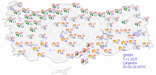 Haftanın ortasında soğuk ve yağışlı hava Türkiye'nin büyük bir bölümüne yayılıyor. Batıdan başlayarak neredeyse tüm yurtta yağmur ve sağanak yağışlar hakim oluyor. Sıcaklıklar önemli ölçüde düşüş gösteriyor; neredeyse hiçbir bölgede 25 derece ve üzeri sıcaklıklar görülmüyor. Özellikle Marmara, Ege, İç Anadolu ve Karadeniz bölgelerinde sıcaklıklar 10-17 derece aralığına inmiş durumda. Doğu ve Güneydoğu Anadolu'da da sıcaklık düşüşü ve yağışlar bekleniyor. Bu gün, beş günlük periyodun en soğuk ve en yağışlı günü olarak öne çıkıyor.