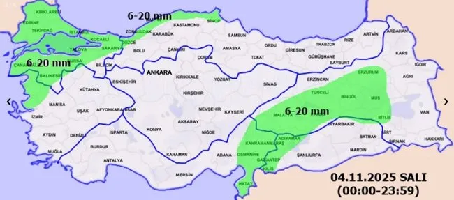 4 Kasım Salı günü, Türkiye genelinde iki ana bölgede orta şiddette yağışlar beklenmektedir. Batı Bölgesi: Marmara'nın batı ve güney kesimleri (özellikle Çanakkale, Balıkesir, Tekirdağ, İstanbul, Kocaeli, Yalova ve Bursa'nın batısı) ile Batı Karadeniz'in kıyı şeridinde (Zonguldak, Bartın, Kastamonu) 6-20 mm aralığında yağış tahmin edilmektedir. Bu miktar, günlük yaşamı olumsuz etkilemeyecek, ancak hissedilir derecede ıslaklık yaratacak bir yağış seviyesidir. Doğu ve Güneydoğu Bölgesi: Doğu Anadolu'nun güney ve güneydoğu kesimleri (Tunceli, Bingöl, Muş, Bitlis, Erzurum'un güneyi, Malatya, Adıyaman, Kahramanmaraş) ile Hatay ve Osmaniye çevrelerinde de benzer şekilde 6-20 mm aralığında yağış beklenmektedir. Diğer Bölgeler: Haritaya göre, İç Anadolu'nun büyük bir kısmı, Ege ve Akdeniz'in kıyı şeritleri ile Güneydoğu Anadolu'nun doğu illerinde belirgin bir yağış miktarı (6 mm ve üzeri) beklenmemektedir.