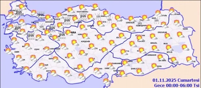 Cuma sabah saatlerinde ülkenin batı ve kuzey kesimlerinde yoğun sis ve pus hakimdir. Özellikle Trakya, Marmara, Batı Karadeniz ve İç Anadolu'nun kuzeybatısı ile bazı Doğu Karadeniz illerinde sis etkili olmaktadır. Sisli bölgeler dışında kalan güney, güneydoğu ve iç bölgelerin büyük çoğunluğunda hava az bulutlu ve güneşli olacaktır. Sisli bölgelerde görüş mesafesinin düşük olması beklenmektedir.