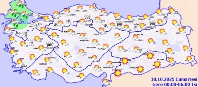 Cumartesiye geçişle birlikte Batı'dan gelen yağışlı sistem etkisini artırarak tüm Batı Marmara'yı (Edirne, Kırklareli, Tekirdağ) ve İstanbul çevresini kapsıyor. Gece boyunca sis (PUS/SİS) İç Ege, İç Anadolu'nun kuzeyi ve özellikle Karadeniz Bölgesi'nin tamamına yakınında, kıyı ve iç bölgelerde yoğun bir şekilde devam etmektedir. Yağışlı ve sisli havanın aksine, Güneydoğu Anadolu Bölgesi'nde hava az bulutlu ve açık bir şekilde seyretmektedir.