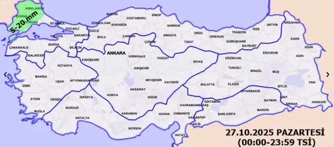 Pazartesi günü (27 Ekim 2025) yağışlı alanın büyük ölçüde daralarak sadece Trakya'nın en kuzeybatı ucunda yoğunlaşması beklenmektedir. Kırklareli'nin kuzey kesimlerinde 5-20 mm aralığında yağış görülmesi beklenirken, Türkiye'nin geri kalan büyük bir bölümü (Marmara'nın diğer illeri, Ege, Akdeniz, İç Anadolu, Karadeniz, Doğu ve Güneydoğu Anadolu) yağışsız bir gün geçirecektir.