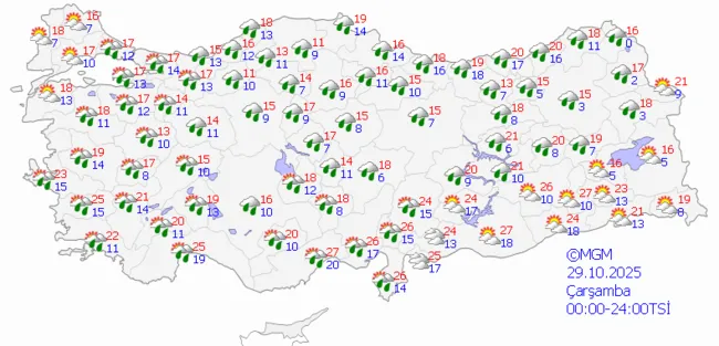 Asıl değişim ise 29 Ekim Çarşamba günü yaşanacak. Batıdan gelen yeni ve serin hava kütlesi, tüm yurdu etkisi altına almaya hazırlanıyor. Sıcaklıklar Çakılıyor: Haftanın ilk yarısında 25-28 derece civarında seyreden sıcaklıklar, Çarşamba günü Marmara ve Ege'de 16 derece ile 19 dereceye kadar sert bir düşüş yaşayacak. Bu, bazı şehirlerde 10 dereceye varan bir soğuma anlamına geliyor.