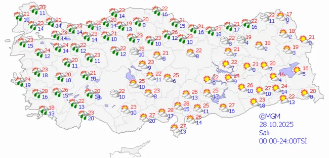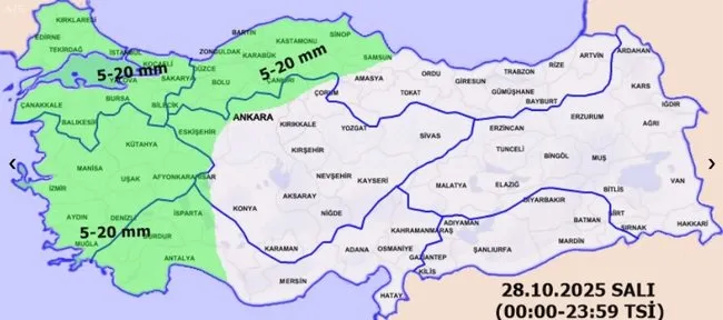 Salı günü (28 Ekim 2025) yağışlar tekrar Batı ve kısmen İç Anadolu'yu etkilemeye başlıyor. Marmara Bölgesi'nin tamamı, Ege Bölgesi'nin büyük bir kısmı (İç Ege dahil), Batı Akdeniz'in batı kesimleri (Muğla, Antalya'nın batısı, Burdur, Isparta) ve Batı Karadeniz'in kıyı kesimlerinde (Zonguldak, Düzce, Kocaeli, Sakarya, Bolu, Karabük) yağışlar 5-20 mm aralığında tahmin edilmektedir. Başta İç Anadolu ve Doğu Karadeniz olmak üzere, ülkenin orta ve doğu kesimlerinin büyük bir bölümünde (Ankara, Konya, Kayseri, Sivas, Erzurum, Trabzon, Rize, Diyarbakır, Van vb.) ise yağış beklenmemektedir.