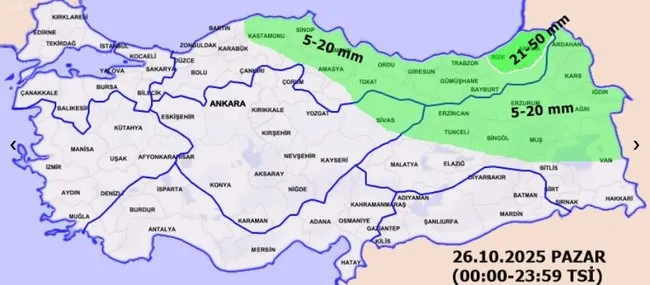 Pazar günü (26 Ekim 2025) yağışlı hava kütlesi ülkenin doğu kesimlerine doğru kaymaktadır. En kuvvetli yağışlar, Doğu Karadeniz'in doğusunda (Rize, Artvin) ve Ardahan'ın kuzeyinde 21-50 mm olarak beklenmektedir. Karadeniz Bölgesi'nin tamamı, Doğu Anadolu Bölgesi'nin büyük bir kısmı ve Güneydoğu Anadolu Bölgesi'nin doğu illerinde (Trabzon, Gümüşhane, Bayburt, Erzurum, Erzincan, Sivas, Tokat, Amasya, Çorum, Kastamonu, Sinop, Ordu, Giresun, Ağrı, Kars, Iğdır, Van, Muş, Bitlis, Diyarbakır, Batman, Siirt) yağışlar 5-20 mm aralığında tahmin edilmektedir. Ülkenin batı, iç ve güney kesimleri (Ege, Akdeniz, Marmara, İç Anadolu'nun büyük bölümü) bu haritaya göre yağışsız görünmektedir.