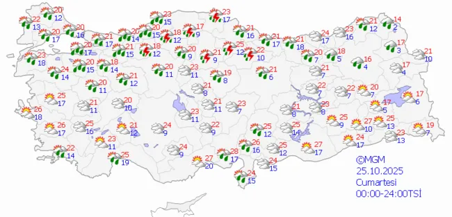 Cumartesi günü, Türkiye genelinde parçalı bulutlu bir hava hakim. Batı bölgelerde, özellikle Ege ve Akdeniz kıyılarında yer yer sağanak yağışlar ve gök gürültülü sağanak yağışlar görülüyor. Marmara'nın batısı ile Trakya kesiminde de sağanak yağış bekleniyor. Orta ve Doğu Karadeniz kıyılarında hafif sağanak yağış ihtimali var. İç ve doğu kesimlerde genellikle güneşli veya az bulutlu bir hava öngörülüyor. En yüksek sıcaklıklar batı ve güney kıyılarda 25 derece ile 27 derece civarında, iç bölgelerde ise 20 derece ile 24 derece arasında değişiyor. Doğu Anadolu'nun yüksek kesimlerinde en yüksek sıcaklıklar 17 derece civarında.