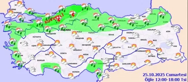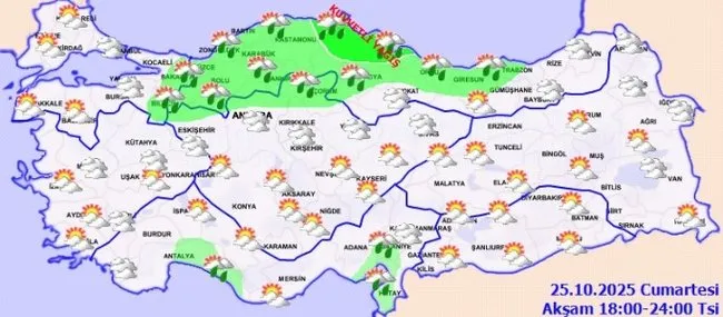 Hafta sonu boyunca dikkatler kuzey bölgelere çevriliyor. Batı Karadeniz Alarmda: Cumartesi günü (25 Ekim) özellikle Batı Karadeniz'in iç ve doğu kesimleri (Bolu, Zonguldak, Kastamonu çevreleri) kuvvetli ve şiddetli sağanak yağışların etkisi altında kalacak. Ani sel, su baskını, yıldırım ve yağış anında fırtına riski bulunuyor.