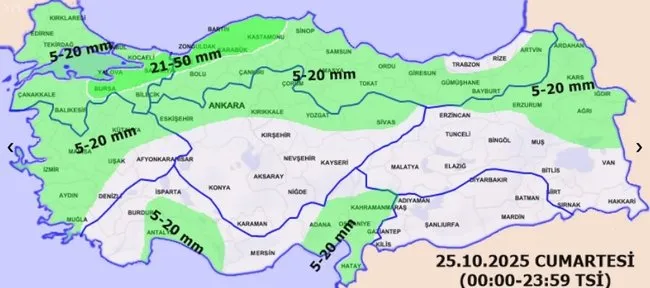 Cumartesi günü (25 Ekim 2025) yağışlı hava daha da yaygınlaşarak ülkenin büyük bir bölümünü etkileyecektir. Marmara'nın doğu kesimlerinde (Kocaeli, Sakarya, Düzce) yağış miktarının bir önceki güne göre artarak 21-50 mm aralığına ulaşması beklenmektedir. Ülkenin batısında, özellikle Ege ve Batı Akdeniz'in kıyı ve iç kesimlerinde (İzmir, Manisa, Aydın, Muğla, Denizli, Uşak, Kütahya, Afyonkarahisar, Burdur, Isparta, Antalya) ve İç Anadolu'nun güney ve batısında, Güneydoğu Anadolu'nun güney kesimlerinde ve Doğu Anadolu'nun büyük bir bölümünde yağışlar 5-20 mm olarak tahmin edilmektedir. Yağışsız kalan alanlar İç Anadolu'nun orta ve güneyi (Ankara, Konya, Karaman, Niğde, Aksaray, Nevşehir, Kayseri, Kırşehir, Yozgat), Güneydoğu Anadolu'nun orta kesimleri (Şanlıurfa, Gaziantep, Kilis, Adıyaman, Osmaniye) ve Hatay çevresidir.