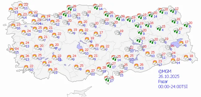 Kıyı Şeridi Yağışlı: Yağışlar Pazar günü (26 Ekim) Orta ve Doğu Karadeniz kıyılarına yayılacak. Güney ve batı bölgeler ise parçalı bulutlu ve yer yer güneşli, mevsim normallerinin üzerindeki sıcaklıklarla geçecek.