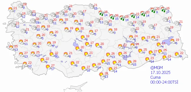 Cuma günü, Batı Karadeniz, İç Anadolu'nun kuzey ve doğusu ile Doğu Anadolu'nun bazı bölgelerinde yağışlı hava sürecek gibi görünüyor. Batı ve güney kıyılarında ise güneşli ve az bulutlu hava etkisini artırıyor. Ege ve Akdeniz bölgelerinde sıcaklıklar 25−29∘C bandında yüksek seyrederken, gece sıcaklıkları 11−14∘C civarında. Yağış alan kuzey ve iç bölgelerde ise sıcaklıklar 18−24∘C arasında değişiyor.