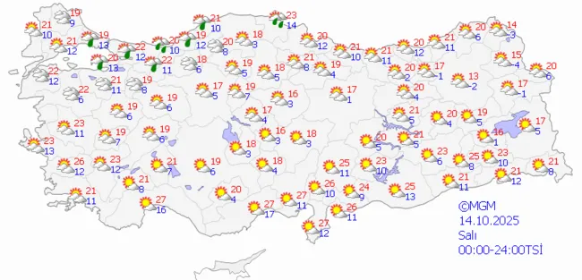 Haritaya göre Salı günü Türkiye genelinde parçalı ve çok bulutlu bir hava hakim. Marmara'nın batısı, Ege ve Akdeniz kıyıları ile İç Anadolu'nun bazı kesimlerinde yer yer hafif yağmur veya sağanak bekleniyor. Kuzey ve doğu bölgelerde ise genellikle bulutlu bir hava var. Sıcaklıklar batıda 20−23∘C civarındayken, iç ve doğu bölgelerde 17−21∘C aralığında seyrediyor. Gece sıcaklıkları ise genel olarak 4−10∘C civarında.