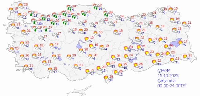Hafta ortasından itibaren, güneşli hava özellikle ülkenin güney kesimlerinde kendini güçlü bir şekilde hissettirecek. Çarşamba (15 Ekim) ve Perşembe (16 Ekim) günleri, Ege ve Akdeniz'de termometreler 25−29∘C seviyelerine tırmanarak, bölge halkına keyifli günler sunacak. Bu bölgelerde güneşli ve açık hava hakimiyeti sürecek.