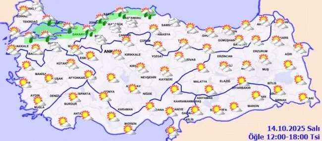 Öğle saatlerinde, Marmara'nın doğu kesimleri (İstanbul, Kocaeli, Sakarya ve Bursa çevresi) ile Batı Karadeniz'in bazı kıyı illerinde (Düzce, Zonguldak, Bartın) yeşil renkle belirtilen yağış geçişleri görülüyor. Bu bölgelerde sağanak yağış veya yağmurlu bir hava bekleniyor. Ülkenin geri kalanında ise hava durumu büyük ölçüde değişmiyor; parçalı bulutlu ve yer yer güneşli hava devam ediyor. İç Anadolu, Ege ve Akdeniz bölgelerinde güneş daha belirgin.