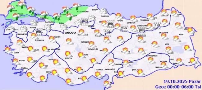 Pazar gününe girerken gece saatlerinde, yağışlı hava kütlesi Marmara'nın kuzey ve Batı Karadeniz'in kıyı kesimlerinde (İstanbul, Kocaeli, Sakarya, Zonguldak, Düzce, Kastamonu'nun kuzeyi) hafif şekilde devam etmektedir. Bu saatlerde dikkat çeken en önemli durum, İç Anadolu'nun doğusu, Karadeniz'in iç kesimleri ve Doğu Anadolu Bölgesi'nin batı ve orta kesimlerinde (Çorum, Yozgat, Sivas, Erzurum, Erzincan, Muş, Kars, Gümüşhane, Bayburt çevreleri) yaygın ve yoğun pus (sis/pus sembolü) oluşumudur. Bu durum, özellikle karayolu ulaşımında görüş mesafesini düşürebilir. Ülkenin güney ve batı kesimlerinde hava parçalı bulutlu ve yağışsızdır.