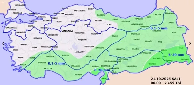 Salı günü yağışlı sistem doğuya kayıyor. En yoğun yağış (6-20 mm) Güneydoğu Anadolu'nun doğusu (Van, Hakkari) ve Doğu Akdeniz'de (Adana, Hatay, Gaziantep) bekleniyor. Diğer doğu ve güney bölgeler 0,1-5 mm yağış alırken, ülkenin batı, kuzey ve iç kesimleri büyük ölçüde yağışsız kalacak.