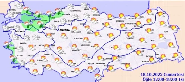 Öğle saatlerinde yağışlı hava kütlesi Marmara Bölgesi'nin kuzeyine (İstanbul, Kocaeli, Sakarya, Yalova çevreleri) ve batı kıyılarına (Çanakkale, Balıkesir'in batısı, İzmir'in batı kıyıları) kayarak etkisini sürdürmektedir. Yağışlar hafif (yeşil alan) ve yereldir. Ülkenin büyük bir bölümü ise parçalı bulutlu ve güneşli bir hava ile günü geçirecektir. Doğu bölgelerdeki pus durumu bu saatlerde dağılmış görünmektedir, güneşli semboller ön plana çıkmaktadır.