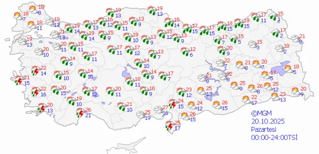 Yeni haftanın ilk günü olan Pazartesi'de yağışlı hava batı ve iç bölgelerde etkisini sürdürüyor. Ege ve Akdeniz'in batı bölgelerinde yine gök gürültülü sağanak yağışlar hakim. Yağışlı hava kuzeybatı ve iç bölgelerin bazı kesimlerine de yayılıyor. Genel olarak sıcaklıklar Pazar gününe göre çok az düşüş göstererek mevsim normallerinde seyrediyor. Doğu ve Güneydoğu Anadolu bölgelerinde ise hava parçalı bulutlu ve yağışsız kalmaya devam ediyor.