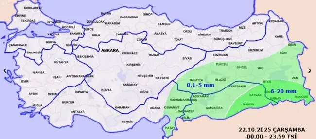 Çarşamba günü yağışlar dar bir alana sıkışıyor. Yoğun yağış (6-20 mm) Doğu ve Güneydoğu Anadolu'nun uç noktalarında (Van, Hakkari, Şırnak) devam edecek. Güneydoğu Anadolu'nun batısı ve Doğu Anadolu'nun orta kesimleri 0,1-5 mm yağış alacak. Ülkenin büyük bir kısmı (Batı, Kuzey ve İç bölgeler) bu gün yağışsız geçecek.