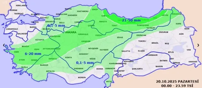 Pazartesi, en şiddetli yağış (21-50 mm) Doğu Karadeniz kıyılarında (Sinop'tan Artvin'e kadar) etkili olacak. Yağış, İç Anadolu, Ege ve Batı Karadeniz'in iç kesimlerinde 6-20 mm civarında seyrederken, Marmara'nın doğusu ve Akdeniz kıyıları 0,1-5 mm ile hafif geçecek.