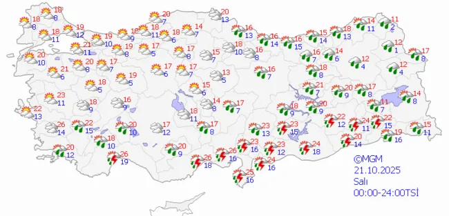 Salı günü yağışlı hava kütlesi daha geniş bir alana yayılıyor ve özellikle ülkenin iç, batı, güneybatı ve orta kesimlerinde etkili oluyor. Akdeniz'in batı ve iç bölgeleri ile İç Anadolu'nun güney kesimlerinde yine gök gürültülü sağanak yağışlar dikkat çekiyor. Batı Karadeniz'de yağışlar görülürken, sıcaklıklar genel olarak bir önceki güne benzer seviyelerde seyrediyor. Doğu Anadolu'da ise hava genellikle parçalı bulutlu ve yer yer yağmurlu (doğu Karadeniz ve çevresi).