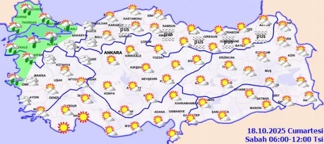Cumartesi sabah saatlerinde, Türkiye'nin genelinde parçalı bulutlu ve güneşli bir hava hakim. Güneydoğu Anadolu Bölgesi'nde hava çoğunlukla açık ve güneşli. Yağış beklenen tek bölge Marmara'nın batısı ve kuzey kıyılarıdır. Tekirdağ, İstanbul'un Avrupa yakası, Kırklareli çevreleri ile Çanakkale'nin kuzey kesimlerinde hafif yağmur (yeşil alan) beklenmektedir. İç Anadolu'nun doğusu, Doğu Anadolu'nun orta ve batı kesimleri ile Karadeniz'in iç kesimlerinde (Çorum, Amasya, Sivas, Gümüşhane, Bayburt, Erzincan çevreleri) pus (pus sembolü) etkili olacaktır.