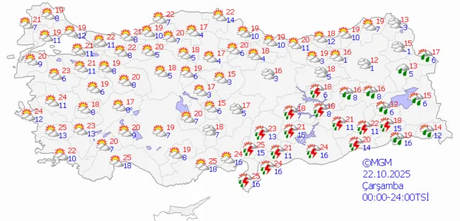 Haftanın ortasında yağışlar Türkiye'nin büyük bir bölümünü etkisi altına alıyor. Ege, Akdeniz, İç Anadolu'nun büyük bir kısmı, Karadeniz'in batı ve orta kesimleri ile Güneydoğu Anadolu'nun bazı bölümlerinde yağışlar bekleniyor. Akdeniz'in iç kesimleri ve İç Anadolu'nun güneyi gibi bölgelerde gök gürültülü sağanaklar devam ediyor. Sıcaklıklar genel olarak bir miktar düşerek mevsim normallerine daha yakın seyrediyor. Ülkenin doğu illerinde de yer yer yağmur geçişleri görülüyor.