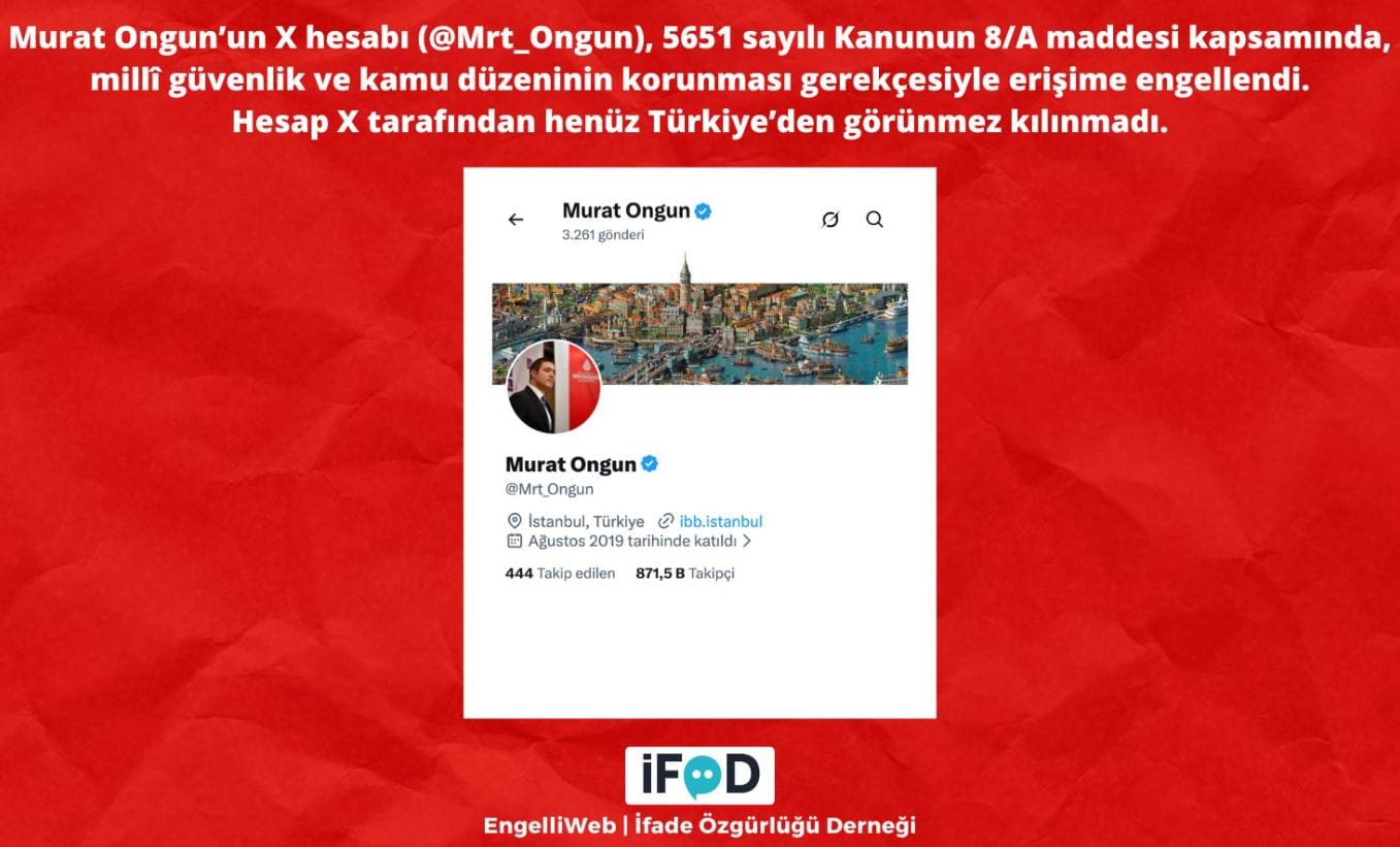 İBB davası kapasımda Mart 2025'ten bu yana tutuklu olan Murat Ongun'un X hesabı, 5651 sayılı Kanunun 8/A maddesi kapsamında, millî güvenlik ve kamu düzeninin korunması gerekçesiyle erişime engellendi.
