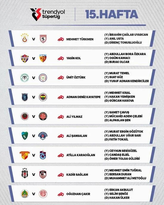 Türkiye Futbol Federasyonu (TFF), Süper Lig’in 15. haftasında görev alacak hakemleri açıkladı. Derbideki kararlarıyla Galatasaray cephesinin sert tepkisini çeken Yasin Kol’un yeni görevi belli oldu.