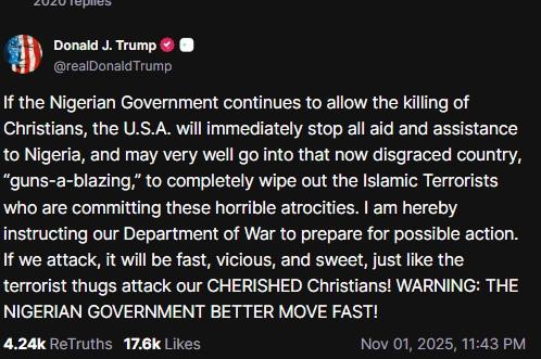 'NİJERYA'YA İSLAMİ TERÖRİSTLERİ TAMAMEN YOK ETMEYE GİREBİLİRİZ'ABD Başkanı Trump, Truth Social hesabından yaptığı açıklamada, "Eğer Nijerya Hükümeti Hristiyanların öldürülmesine izin vermeye devam ederse, ABD derhal Nijerya’ya yapılan tüm yardım ve desteği kesecek.