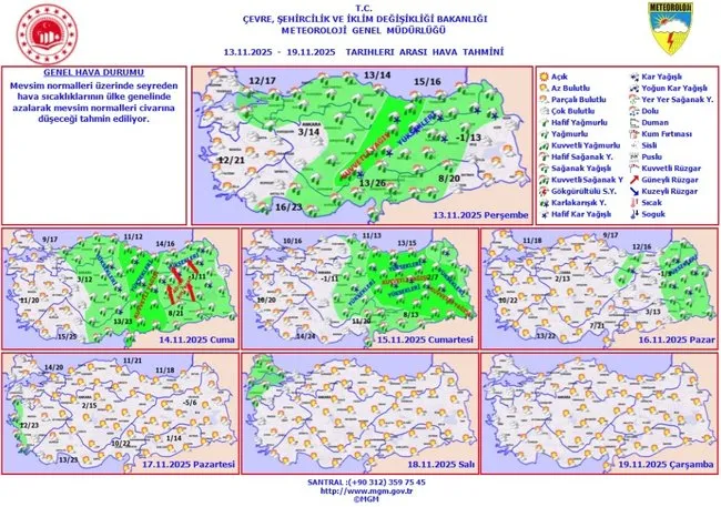 Türkiye, 13 Kasım Perşembe günü batı ve güneybatı kıyılarında 20 derece ve üzerinde sıcaklıklarla güneşli ve parçalı bulutlu bir hava yaşarken; Karadeniz ve Doğu Anadolu'nun kuzeyinde yağışlarla karşılaşıyor. Ancak, Cuma (14 Kasım) günü, yağışlı sistemin ülkenin geneline yayılmasıyla birlikte sıcaklıklar hissedilir derecede düşüyor ve Marmara, Ege, İç Anadolu ve Doğu Anadolu'da karla karışık yağmur veya kar yağışı görülüyor. Cumartesi (15 Kasım) günü yağışlar ağırlıklı olarak doğu ve güneydoğu bölgelerinde devam ederken, sıcaklıklar düşük seyrediyor. Hafta sonunun ikinci günü olan Pazar (16 Kasım) ile birlikte hava durumu tamamen değişiyor; güneşli ve ılıman hava geri dönüyor, batı bölgelerde en yüksek sıcaklıklar tekrar 20 derece civarına yükseliyor ve yağışlar sadece Doğu Anadolu'nun kuzeydoğu kesimlerinde (kar şeklinde) kalıyor. Son olarak, Pazartesi (17 Kasım) günü ülke genelinde açık, güneşli ve sıcak bir hava hakim oluyor, Marmara, Ege ve Akdeniz bölgelerinde sıcaklıklar 20-25 derece aralığına ulaşarak Türkiye mevsim normallerinin üzerinde ılıman bir haftaya başlangıç yapıyor.