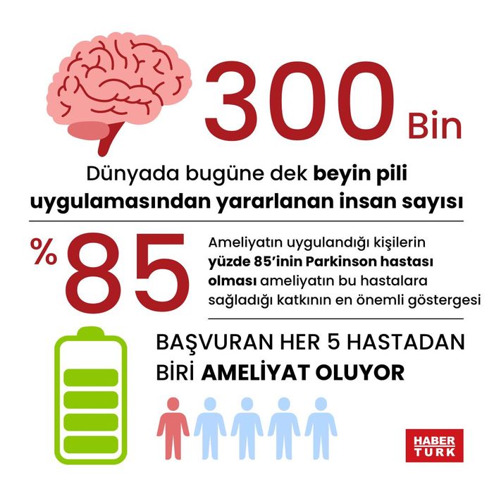 BEYİN PİLİ AMELİYATLARININ YÜZDE 85'İ PARKİNSON HASTALARINABeyin pili, Parkinson hastalığı türü hareket bozukluklarının tedavisinde kullanılan cerrahi bir yöntem olarak tanımlanıyor. Beyne yerleştirilen elektrotlar aracılığı ile düşük voltajlı elektrik uyarıları gönderilmesini içeriyor ve uygun hastaya uygulandığında yüz güldürücü sonuçlar veriyor. Bu noktada en önemli şeyin, yapılan işte tek kişinin değil deneyimli bir ekibin ortak çalışmasının getirdiği fark olduğu belirtiliyor. Dünyada bugüne dek beyin pili uygulamasından yararlanan insan sayısı 300 binin üzerinde. 1987 yılından beri yapılan bu ameliyatın uygulandığı kişilerin yüzde 85'inin Parkinson hastası olması ameliyatın bu hastalara sağladığı katkının en önemli göstergesi olarak kabul ediliyor. Parkinson nedeniyle hareketleri yavaşlayan, kas sertliği, titreme ve yürüme sorunları yaşayan kişiler beyin pili ameliyatı sayesinde adeta yeni bir yaşama kavuşuyor.